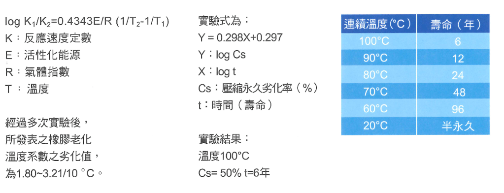 北名壓接接頭所採之安全O型環,是高品質EPDM優質橡膠,具高耐熱性、高安定性、高耐久性,廣泛應用於車輛零件、建材、電線電纜及各種工業。如同一般化學物質,橡膠會受溫度之影響而劣化。為了檢測橡膠耐用年限,實驗如下: