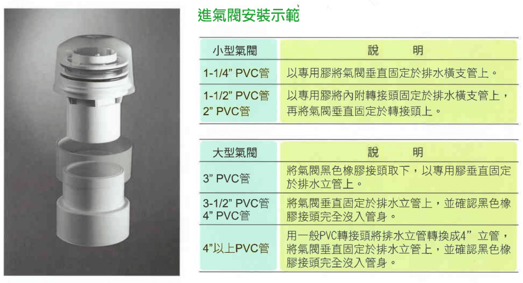| 吸氣量差異比較 | 吸氣閥之進氣量大小影響排水效率,吸氣量大排水效能佳。 | 吸氣閥之進氣量大小影響排水效率,吸氣量小排水效能差。 | 吸氣閥之進氣量大小影響排水效率,吸氣量小排水效能差。 |