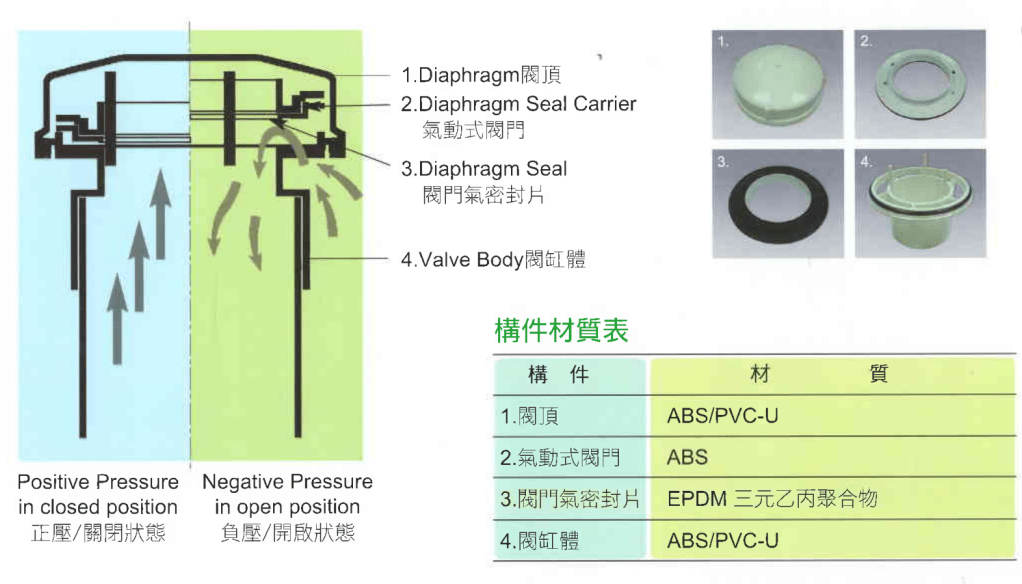 | 綜合比較 | 勝!吸氣量最大,且閥頂可拆方便日後清潔維護。 | 非正2吋及4吋吸氣量小,容易作動不正常。 | 售價高。 吸氣量小,不易清潔維護。 |