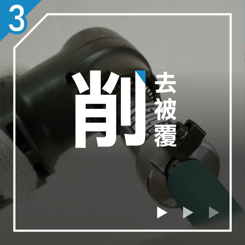 3. 削去被覆管外皮(假設採用被覆管材):使用外皮削除器(或俗稱剝皮器,可參照本公司官網工具介紹影片)快速去除被覆管外皮,避免使用美工刀縱切造成鋼管刀痕導致漏水。
