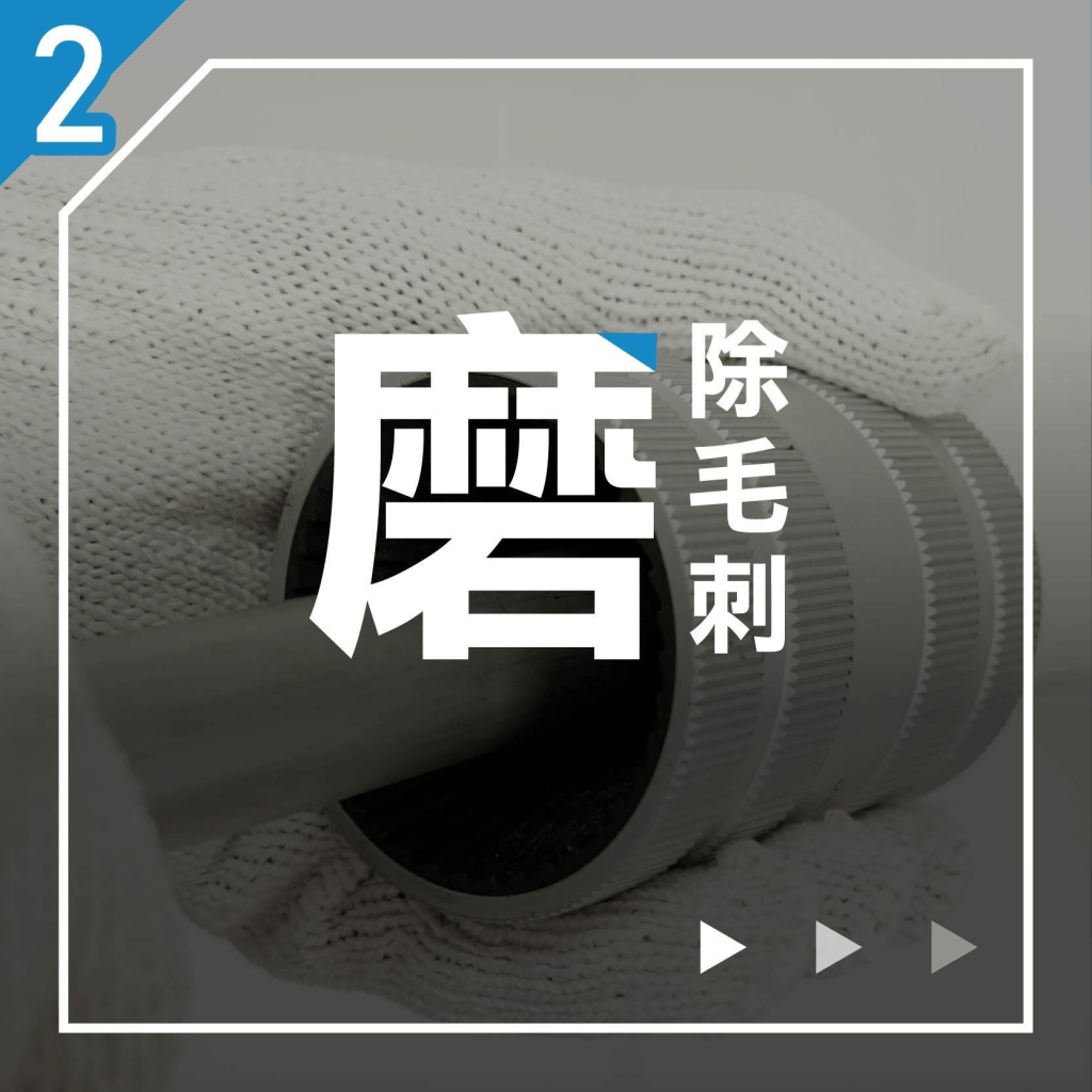 2.磨除毛刺:確認管口平滑無毛邊,避免割損接頭內的安全O型環,使用工具對管口內外端磨除銳利倒角。